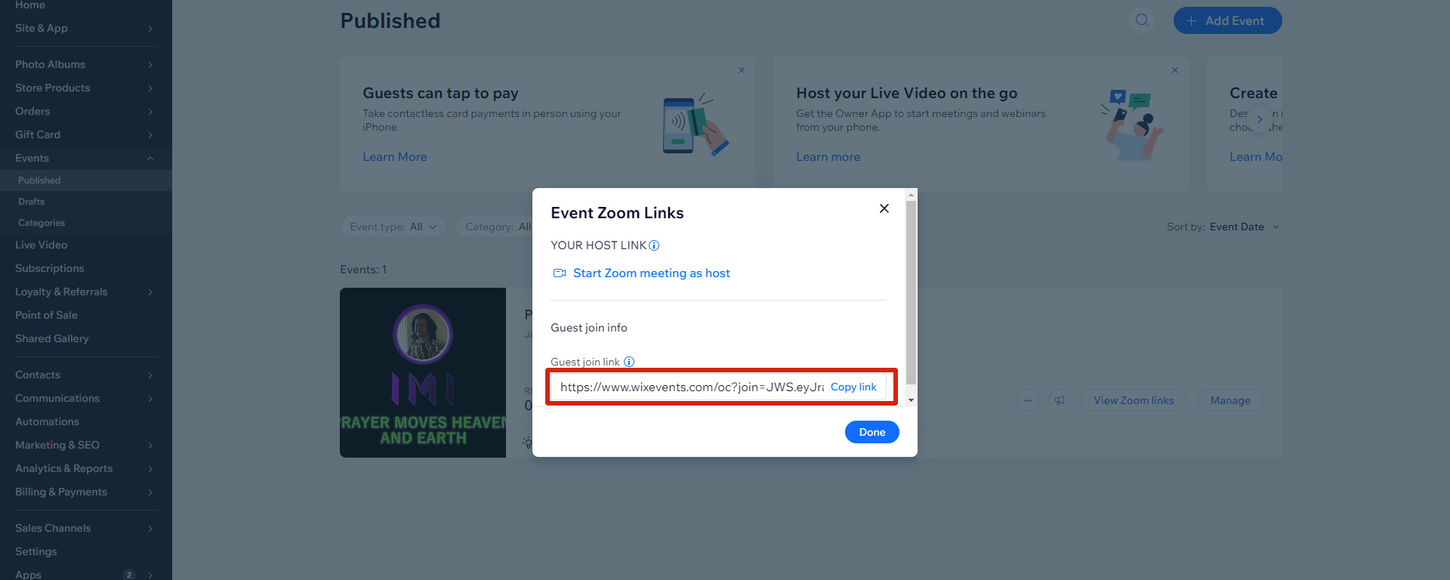 2c. Event - Guest Link (only to be shared the day of the Event - link can be found in Wix Dashboard/Events)